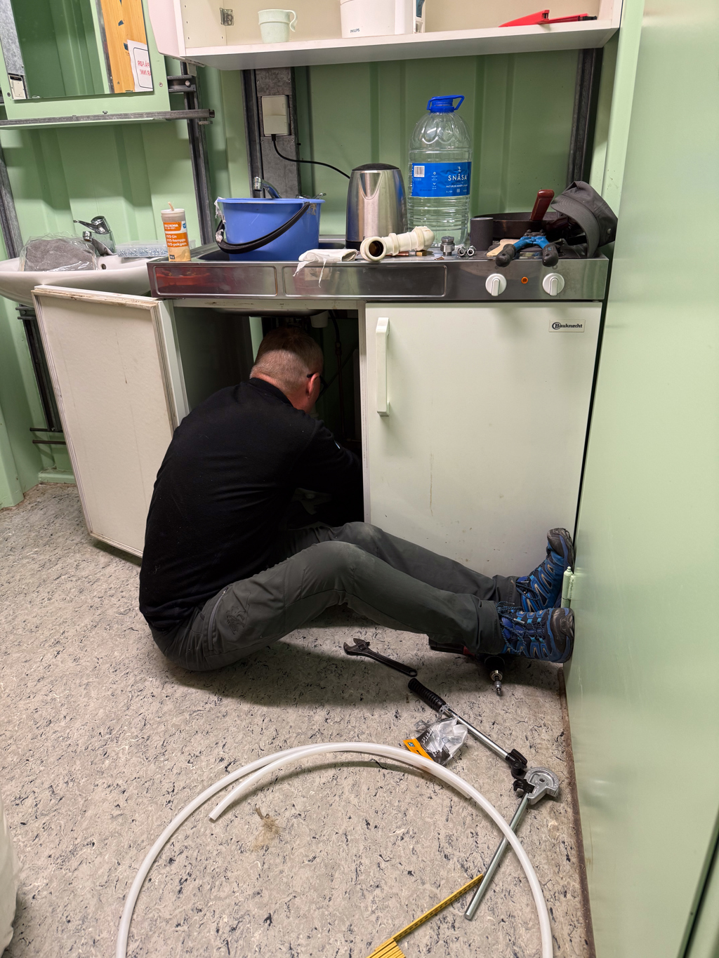 I noe tid har kommandoanlegget vært uten vann etter en lekkasje. Dermed har vi ikke hatt toilett, vann til kaffe(!!) eller til renhold. Vi fikk kjøpt inn noen rørdeler som ble skiftet ut, og fikk på plass igjen varmtvannsberederen. Dermed har vi toilett, vask, oppvaskekum og dusj. Og det gjør det enklere, og ikke så "gruafullt", å gjennomføre dugnader. Det være seg vedlikehold av IDA systemene eller arbeid med historieprosjektet.